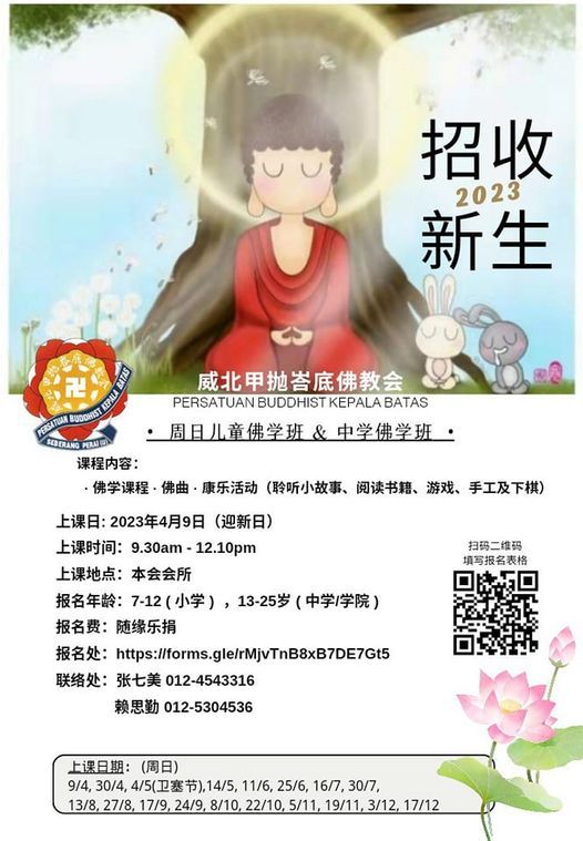 甲抛峇底佛教会周日佛学班将于2023年4月9日正式实体开课!现已开始接受google form报名!欢迎新旧生网上报名,报名从速,以方便各班级老师设立班级组群,我们4月9日见!